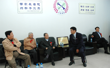 劉院長向前來出席圖書館開館儀式的省政協(xié)原副主席蘇明先生(左二)、原省教委主任、我院專家組首席顧問戴居仁先生(左一)介紹現(xiàn)代學(xué)院的發(fā)展