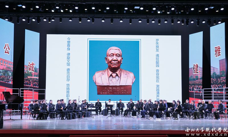 紀(jì)念音樂會現(xiàn)場氣氛典雅莊重、沉靜肅穆,老校長特意為音樂會撰寫了長聯(lián)“歲失良友,魂駐韶園,音容宛在,激越清聲常回蕩;今塑尊身,律旋文館,德范自存,悠揚(yáng)雅韻永流芳”,并通過電子屏展示在舞臺兩側(cè)。