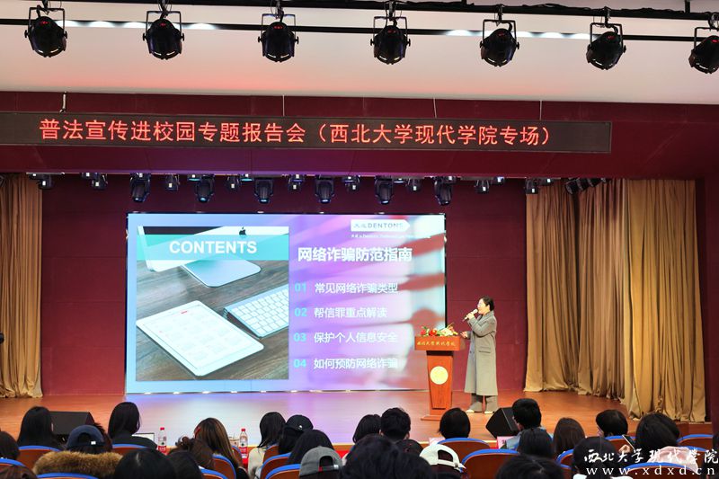 報(bào)告會(huì)由我校工會(huì)副主席、團(tuán)委副書(shū)記王若陽(yáng)老師主持,工會(huì)專(zhuān)兼職干部、學(xué)生處輔導(dǎo)員及200余名學(xué)生代表參加會(huì)議。會(huì)前,參加活動(dòng)的長(zhǎng)安區(qū)人大代表向師生們發(fā)放了精心準(zhǔn)備的普法宣傳資料包。